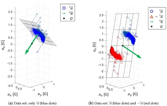 The calculation of the predominant plane and the normal vector is done by Principal Component Analysis (PCA), where the first two principal components represent the predominant plane while the 3rd component is . The data set for PCA calculation includes both the acceleration data () and their origin symmetric data (), see Figure 2b. The reason for adding is to restrict the predominant plane to crossing the origin. Otherwise error in fitting may occur, like in Figure 2a.