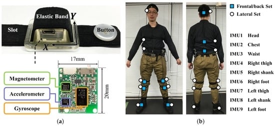 The IMU sensor used in the experiment is named WB-4R (Waseda bioinstrumentation 4R), which is a compact and light-weighted (17 mm × 20 mm × 8 mm, 3.9 g) Inertial Measurement Unit (IMU) containing a 3-axis accelerometer, a 3-axis gyroscope and a 3-axis magnetometer. The detailed characteristics of WB-4R sensor can be found in the reference [27]. As shown in Figure 4a, the WB-4R is attached to an elastic band which helps to tighten the sensor on human body. The elastic band has a button and slots on it, which allows fast and easy setup for experiment.