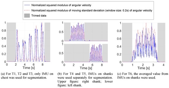 Before joining into a larger data set, data in each repetition is trimmed automatically through thresholding on the normalized squared modulus of angular velocity and moving standard deviation to exclude the recording without movement, see Figure 5.