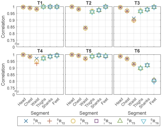 From Objective 1 and Objective 2, the correlations are overall high between sensors on different sides of the same body segment, and between the sensors on the different body segments when they are moving together, except for the waist and the feet. The correlation is not related with which test is used for generating the alignment matrix () but related with on which body segment and in which test the matrix is applied ().