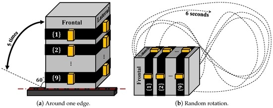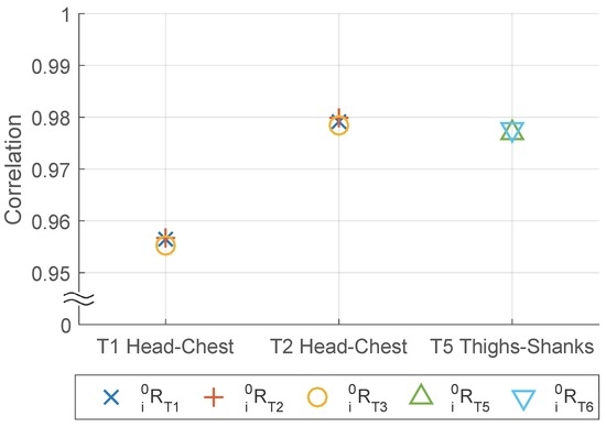 Furthermore, , , and the rotation matrices are calculated from each data set constructed in the last step, by using Equations (1), (4) and (5). The calculation is limited on subsets of IMUs depending on the test, see Table 2.