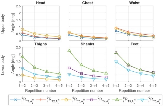 The “incremental” comparison shown in Figure 9 suggests that the rotation matrix is gradually converging to zero, and the change in decreases as increase of the number of repetitions. Besides, the change caused by adding repetitions is small. The maximum of averaged error angle is less than 2.5° for all the and body segments, and after including three repetitions the change caused by adding one more repetition in is less than one degree.