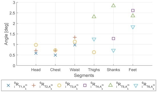 Through the “To last” comparison shown in Figure 10, we find that the lower limbs (thighs, shanks and feet) showed relatively larger change compared with the upper body, although the maximum change for all segments is still less than 3 degrees. The larger change can be caused by larger variance between different repetitions due to the lower motion repeatability, or by the larger error in matrix estimation from each repetition due to the more divergent distribution of acceleration data. The waist and feet have the highest change within the upper body and the lower limbs, respectively.