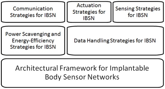 The building components of the IBSN, such as the sensors for measuring physiological data, the medical devices for delivering medical therapies, the implantable radio, and the microprocessor are commercially available. Functionality of these components is trivial, however the environment and the requirements of IBSN make the functionality of these devices non-trivial. For a closed-loop operation, it is important that the components of the IBSN are integrated in an optimized architecture to ensure reliability, energy-efficiency, and QoS. The architectural framework of IBSN will define: