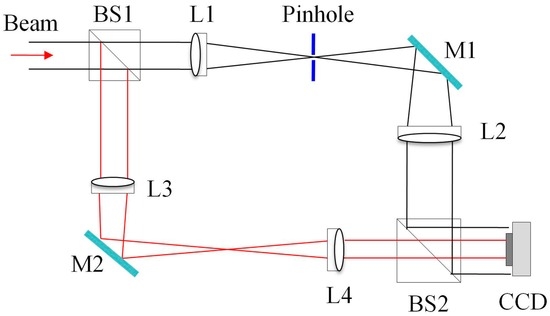 Experimental setup of SRI-WFS: BS1, BS2, beam-splitters, L1–L4, lens with the focal length f1 = f4 = 100 mm and f2 = f3 = 300 mm, respectively; pinhole, spatial filtering plate with diameter dpin = 25 μm; M1, M2, reflection mirrors.