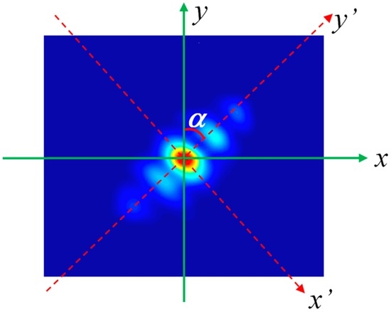 As the analysis above, generally, the intensity profile of the output beam emitted by a multimode stable cavity is non-rotational symmetric or asymmetric beams, as shown in Figure 2. According to Sigman’s theories [1,2], the quality of the laser beam is evaluated by in x-direction and in y-direction. However, we found that the values of and are non-unique if we rotate coordinate the axis in an astigmatic laser beam. Consequently, just using the simple parameters and to characterize the beam quality of an asymmetric beam is not comprehensive or objective [9,29,30].