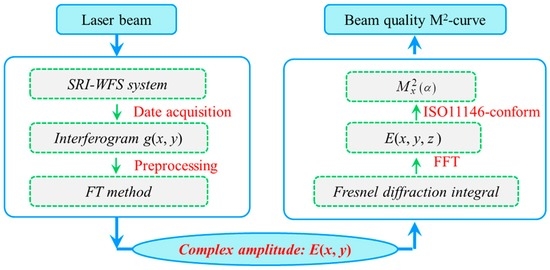 where and are waist radius and divergence half angle in the x-direction with a rotation angle α of coordinate axis, respectively. M2 can obtain different values if the rotation angle α charges with the coordinate axis, that is, a track of the M2 values versus the rotation angle (α) of the beam coordinate axis will be form and named M2-curve which is unique to a specific tested beam. It can be seen from the Equation (35) that the M2-curve takes into account changes in angle and can give a track of the M2 values which is compared to the rotation angle α of the beam coordinate axis. That is, the M2-curve contains all the values of beam quality M2 in all directions. The traditional M2 factor in x-direction and in y-direction are just special cases of the M2-curve in a special direction of the tested beam, precisely in two orthogonal directions (x-axis and y-axis). Therefore, the M2-curve has a more comprehensive physical meaning and is more objective for characterizing the beam quality because it can be uniquely determined for a particular tested beam. In other words, there is a one-to-one mapping relationship between a particular tested beam and its sharp of M2-curve. According to the above analysis in Section 2 and Section 3, we can summarize the flow chart of the M2-curve determined by the SRI-WFS method, as shown in Figure 3.