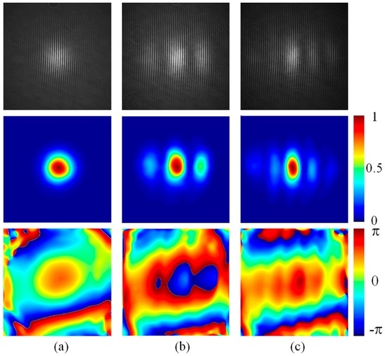 Adjusting a slight tilt angle in the cavity mirrors, we can obtain different mix-mode beam outputs whose intensity profiles are similar to the Hermite-Gaussian mode in TEMmn. For the convenience of the following analysis, we denote these mix-mode beams as Hermite-Gaussian-like modes in TELMmn to distinguish with the pure Hermite-Gaussian modes in TEMmn. As shown in Figure 4, three intensity profiles corresponding to Hermite-Gaussian-like modes in TELM00, TELM20, and TELM40, respectively, are used as the test beams in our experiments. Corresponding interferograms formed with SRI-WFS are shown in Figure 5 (up row). The reconstructed intensity profiles (middle row) and the reconstructed wrapped phase distribution (low row) of the test beams are also shown in Figure 5. Each reconstructed distributions of amplitude and phase for the test beams are extracted from a single interferogram according to Equations (7)–(10). Considering the limited of conditions in our laboratory, we only investigate the intensity distribution for comparative analysis. For a quantitative comparison of the measurement and reconstruction intensity profile, two-dimension cross-correlation coefficient Cc is used as a metric [24]. Here Cc is defined as the cross-correlation between the images of measurement intensity distribution IM(x, y) and reconstruction intensity distribution IR(x, y), and Cc = 1 is indicated that the measured intensity profile and reconstructed intensity profiles match perfectly. In our experiment, the Cc of the reconstructed and measurement intensities for the Hermite-Gaussian-like modes in TELM00, TELM20 and TELM40 are 0.999, 0.998 and 0.997, respectively.