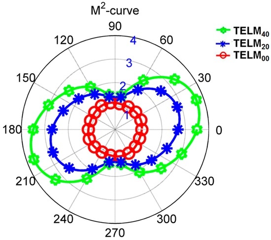 M2-curves of Hermite-Gaussian-like modes in TELM00, TELM20, and TELM40. Here, the numbers 1, 2, 3, and 4 are the circular scale for the M2-curve.