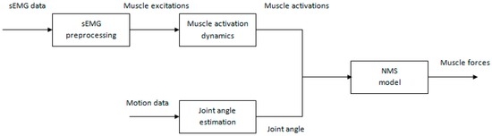 The flowchart of our muscle force prediction method. It consists of four main parts: sEMG preprocessing, muscle activation dynamics, joint angle estimation, and NMS model.
