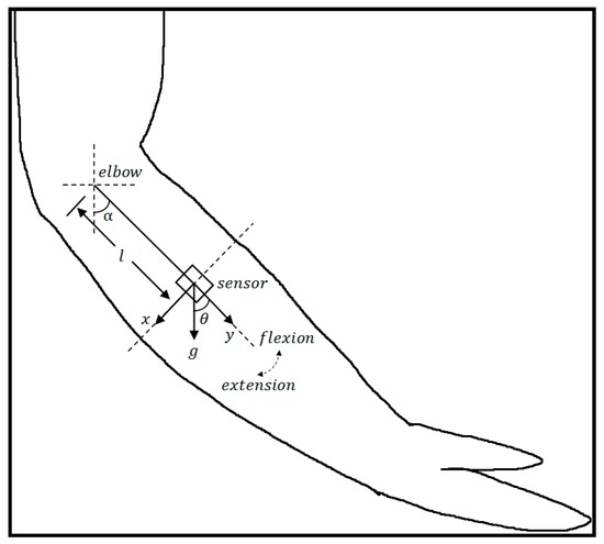 Location of the inertial sensor. The sensor was attached to the lateral side of the forearm. is the elbow joint angle of flexion and extension. x and y represent the sensor’s X-axis and Y-axis respectively. l is the distance between the sensor and elbow. represents the earth gravity. The elbow join angle can be obtained by fusing the sensor’s acceleration and angular rate.