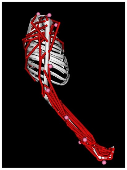 Muscle kinematics transforms the joint angle into muscle kinematics parameters such as musculotendon unit (MTU) lengths and moment arms using an upper limb musculoskeletal model [19] based on OpenSim [21]. This upper limb musculoskeletal model is shown in Figure 3, which should be scaled to match the subject’s anthropometry first. We also employed the OpenSim Inverse Dynamics Tool to get the experimental joint moment. More details about scale and Inverse Dynamics Tool are described in other articles [21,22]. In general, OpenSim upper limb model characterizes the transformation from joint angle to muscle kinematics parameters, which is a necessary prerequisite to individual muscle force prediction.