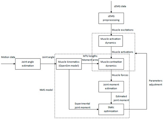 Static optimization was used to adjust system parameters in muscle activation dynamics and muscle contraction dynamics. This calibration process aimed at matching the subject’s specific EMG-force generating properties. A simulated annealing algorithm [23] was used to minimize the root mean square error (RMSE) between the experimental and estimated joint moment by varying parameters within pre-defined boundaries. The entire flowchart of calibration is shown in Figure 4.