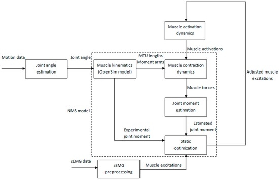 Following calibration, we employed a novel set of trail as input to drive the calibrated model. This simulation process is shown in Figure 5. Unlike calibration, the simulation process took adjusted muscle excitations as inputs of the muscle activation dynamics. This adjustment mechanism aimed at reducing the disadvantage of the effect of uncertainties in sEMG signals. Adjusted muscle excitations can be obtained using the following static optimization method: