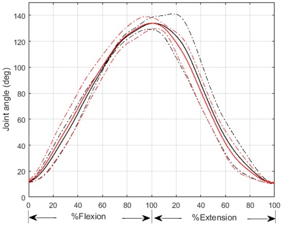 Comparison between experimental and estimated joint angle. The black and red solid lines represent the average experimental and estimated joint angles respectively. The black and red dash dotted lines represent the standard deviations of the experimental and estimated joint angle respectively. The average elbow flexion-extension duration is about 5.8 s.