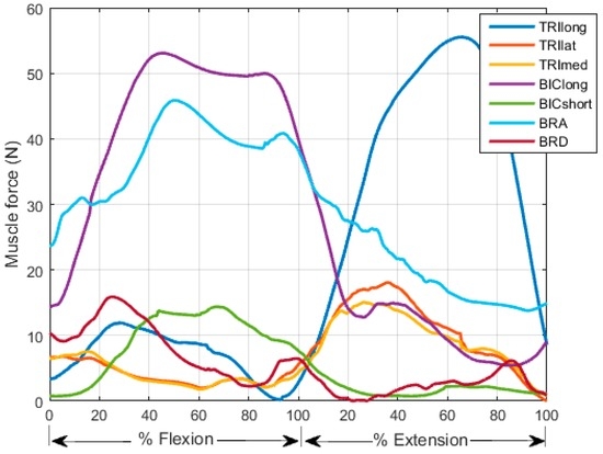 Estimation of individual muscle forces during elbow flexion and extension of one subject ( = 0.8). BIClong and BRA are the main action muscles in the flexion phase. TRIlong is the main action muscle in the extension phase.