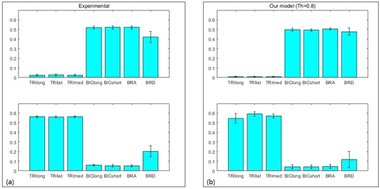 Muscle synergy analysis. NMF was used to extract muscle synergy patterns. (a) The experimental muscle synergy patterns; (b) the adjusted muscle synergy patterns ( = 0.8). The scalar products between experimental and adjusted muscle synergy patterns are above 95% of all the four subjects.