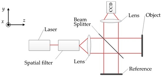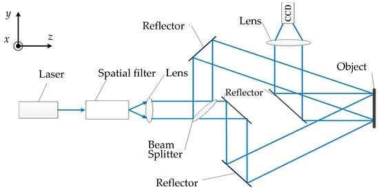As shown in Figure 1, the configuration is similar to that of the Michelson interferometer, except that two mirrors are replaced with the rough metal plates [14]. The beam emitted from the laser is expanded by the spatial filter, then gets partially reflected and partially transmitted by the beam splitter. One segment travels to the object and the other travels to the reference. The two beams reflected by the object and the reference are made to interfere. The lens is used to focus the speckle interferograms onto the sensor of the color CCD camera. A series of frames of the speckle interferograms are recorded as the object is being displaced. Each frame is then a record of the speckle interferograms and their intensity at that instant of time. These interferograms are processed by the wavelet transform and the phase unwrapping algorithm to acquire the phase information. Finally, the object displacement is obtained.