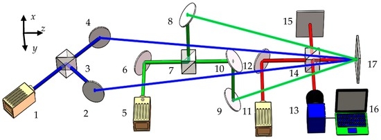 Principle of three-dimensional measurement: 1, 5, and 11 are lasers; 2, 4, 6, 8–10, and 12 are reflectors; 3, 7, and 14 are beam splitters; 13 is the color CCD camera; 15 is reference; 16 is computer; 17 is object.