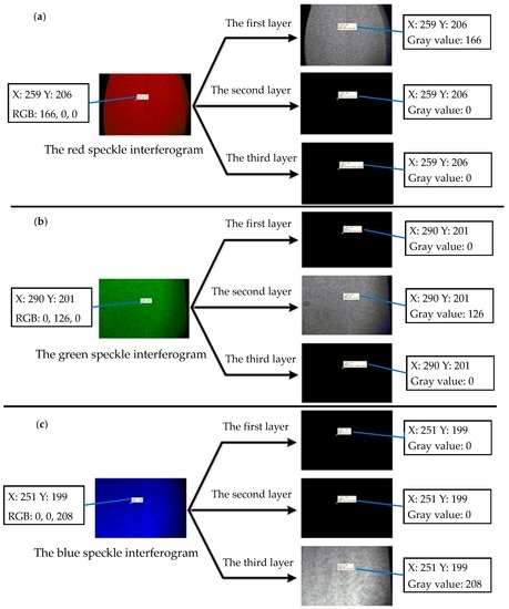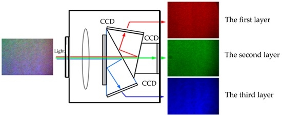 As shown in Figure 4, the mixed speckle interferograms formed by the three lasers are captured by the color CCD camera with three CCDs. The prisms separate the red, green and blue light, then these interferograms are recorded by the corresponding CCD, and each frame of the color CCD camera is divided into three layers to store the data of the R, G and B channels respectively.