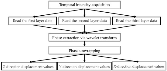 In our built system, the data stored in the first, the second, and the third layer correspond to the displacement information of the z-, y-, and x-direction, respectively. Hence, the matrix with the three layers records entire displacements of the three directions. The sampled speckle interferograms are processed by the wavelet transform and the phase unwrapping algorithm to access the phase information. Finally the dynamic object displacements are obtained.