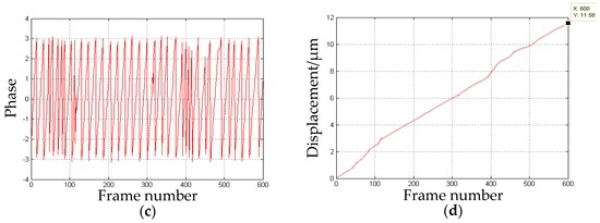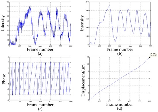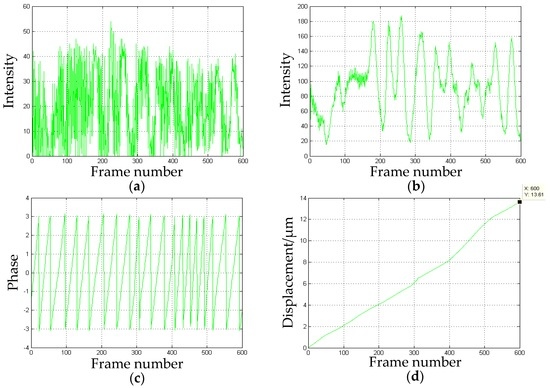 The z-direction displacement: (a) the intensity distribution over time; (b) the intensity after amplification and smoothing processing; (c) the discontinuous phase map obtained by CWT; and (d) the measured displacement over time.