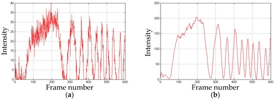 The frame rate of the color CCD camera is 100 frames/s. The whole measuring time is six seconds. Thus, a total of 600 frames are stored. Since the object is a rigid body, an arbitrary point on it is chosen to conduct the measurement.
