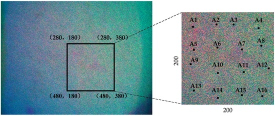 The system is designed for full-field measurement; therefore, multi-detection points of the object are measured to verify the accuracy of the system. The region of interest (ROI) which is chosen arbitarily, is shown in Figure 14. Sixteen points inside this area are processed by the algorithm we developed. The measured results are shown in Table 1.