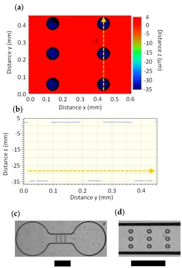 In the first experiment, the imprint template (IT1) contained a 3 × 3 array of cylindrical microcavities in the main microchannel feature, which were 38.5 ± 0.2 µm deep. The cavities had hydraulic diameter dh = 80 µm, which for cylindrical cavities is equal to its cross-section diameter. Profiler measurements for a subsection of this array are shown in Figure 1a,b. After embossing, the resulting cylindrical micropillars appeared as small circles from the top view (Figure 1c,d). A second imprint template (IT2) also had cylindrical microcavities but was 44 ± 0.2 μm deep. See Supplementary Materials for more details.