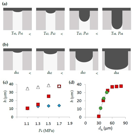 Figure 2a,b shows two different ways to achieve controlled intrusion of the heated polymer into cavities. The first is by controlling embossing conditions Te or Pe. An increase to either results in increases to νf within the cylindrical cavities (and corresponding increases to h of the final embossed features). The second approach to control intrusion is to change the dh of the microcavities (Figure 2b). The first method was used as a calibration step to determine an appropriate combination of Te and Pe for control over the polymer intrusion (Figure 2c). We note that if the Te is too high, full intrusion was achieved into the cavity for all applied Pe (traditional embossing), whereas if it was too low, no value of Pe could result in appreciable intrusion. In the second approach where cavity diameters in the range 30 μm ≤ dh ≤ 100 μm were used controlled h. We demonstrated the generalizability with two imprint templates with different hc values (hc1 = 38.5 μm, hc2 = 44 μm). The mask and embossed features from the two imprint templates are shown in the Supplementary Materials. The relationship between dh and h in PS (Te = 115 °C and Pe = 1.5 MPa) generated from both imprint templates, hown in Figure 2d, is represented by the empirical relation: