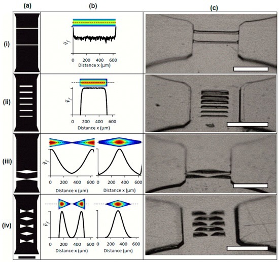 Two-dimensional template design (a) and corresponding ṽf simulation in one and two dimensions (b), and embossing results (c). Close up of imprint template schematics at the feature region for (i) partially occluding straight walls with widths 20 µm (bottom) and 25 µm (top); (ii) free-standing staircase features with widths (bottom to top) 25 µm, 30 µm, 35 µm, 40 µm, 45 µm and 50 µm; (iii) tapered occluding walls and (iv) free-standing tapered features. Results from numerical simulations of ṽf in microcavities formed with masks in (a) are shown adjacent to the relevant design (i–iv) in (b). Colour scale ranges from ṽf = 0 (dark blue) to ṽf = 1 (red) are for qualitative comparison only. Velocity profiles were acquired along the length of the microcavity cross-section at its middle (marked with a dashed line). Grazing angle images of PS microchannels (c) that correspond to imprint template schematics in (a). Embossing conditions to produce images in (c) were: Pe = 1.5 MPa and Te = 110 °C (i), Pe = 1.5 MPa and Te = 105 °C (ii), Pe = 1.5 MPa and Te = 105 °C (iii) and Pe = 1.5 MPa and Te = 110 °C (iv). Common scale bar for (a) is 500 µm. All scale bars for images in (c) are 500 µm and all channels were 640 µm wide.