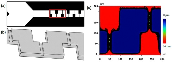 A microfluidic device with two functional elements was fabricated using the current method. The first element was a three-dimensional serpentine channel sequence that could be used for mixing. Fabrication of three-dimensional serpentine channels are typically far more complicated than for two-dimensional channels. This is because the former can require double sided wafer etching, aligned two layer photolithography and/or three-dimensional writing techniques [34,35,36,37]. Here, we demonstrated a design that uses localized intrusion embossing as a one-step fabrication method for three-dimensional switchback channels. Figure 4 shows the the design used to generate the appropriate imprint template and a three-dimensional rendering of the target channel volume. Embossing in PS was undertaken at Te = 110 °C, Pe = 1.4 MPa with optical profiler results shown in Figure 4c. The approach also has the potential to form other passive mixing structures, such as chaotic mixers [38].