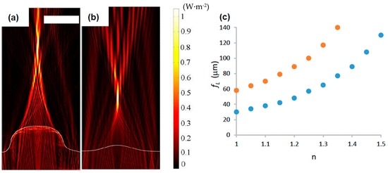 In a downstream segment of the same microfluidic device shown in the preceding section, hot intrusion embossing into an array of cylindrical cavities produced microlens arrays. The lens focal lengths (fL) were varied based on the dh of the cavities. In Figure 5a,b, two measured x, z profiles of lenses with dh = 37.5 µm, dh = 30 µm are shown. Using indices of refraction nPS = 1.58 and nair = 1.33 and the measured dimensions of the lens, a finite element simulation calculated an electromagnetic energy density map, giving fL. Figure 5c shows the effect of channel filling with liquids with different values of n on fL, for the two lenses in Figure 5a,b. See Supplementary Materials for corresponding optical images.