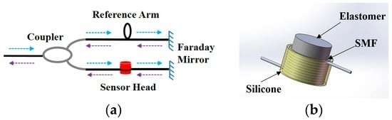 Schematic diagram of (a) the Michelson interferometer-based fiber sensor and (b) the sensor head constructed by winding optical fiber on the elastic cylinder: the single-mode fiber (SMF).