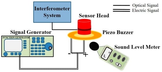 For the Michelson interferometer-based phase fiber sensor, the phase of light propagating along the fiber is directly modulated by the acoustic pressure. Therefore, it is preferable to detect the phase change of light to calibrate its sensitivity [4]. Based on the demodulation system of the Michelson interferometer-based fiber sensor shown in Figure 2, the characterization of frequency response and sensitivity is conducted in the laboratory environment as shown in Figure 3. The related equipment contains an interferometer system with a sensor head and a handheld sound level meter (SLM), which is commonly used in acoustic measurement. A piezo buzzer excited by a signal generator is used as the acoustic source, which can generate sinusoidal acoustic waves in a specific frequency. The SLM is used to calibrate the sound pressure.
