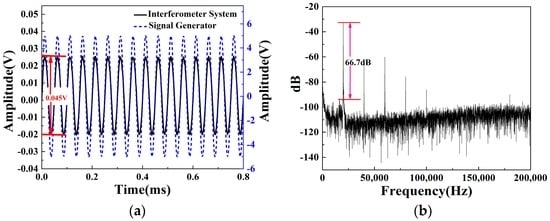According to Equation (5), the optical phase change originating from the vibration of acoustic pressure can induce the optical intensity change in the interferometer sensor. In order to manifest the optical sensitivity of the proposed sensor, we can retrieve the optical phase change information from the optical intensity interference that is converted into the electrical voltage measured by the photodetector as shown in Figure 2. By manipulating the acoustic pressure level, the output peak-to-peak value of the electrical signal is maximized to be 0.1 V, corresponding to the phase change of π. Figure 4a shows when the signal generator generates the sine wave with an amplitude of 5 V, the output signal of the interferometer system follows the same trace with a peak-to-peak value of 0.045 V. Therefore, the output peak-to-peak value of 0.045 V driven by the applied AC voltage of 5 V corresponds to a phase change of 0.47 rad . The phase shift per unit length and unit pressure of this sensor is calculated to be 1.7 at a 20 kHz measurement frequency, which can be regarded as the sensitivity of the sensor [27]. Therefore, the fiber optic sensor head has a sensitivity of 1.7 , which is relatively higher than the sensitivity of the sensors shown in a previous report of 40 [4]. If the sensitivity is calculated in terms of mV, because the peak-peak value of 0.045 V corresponds to a phase change of 0.47 rad, we can convert the value of 1.7 to 163 . A signal-to-noise ratio (SNR) of 66.7 dB with a noise background of about −100 dB can be observed in Figure 4b.