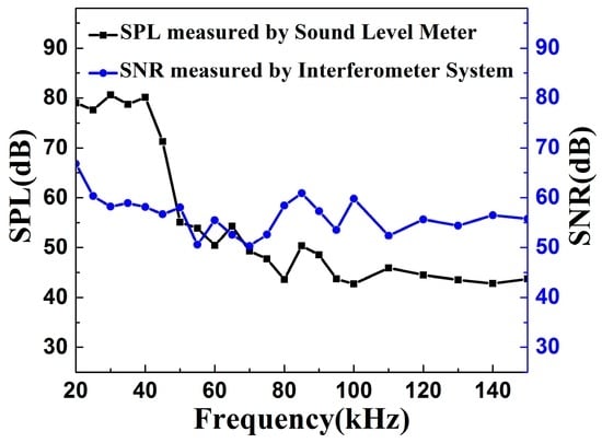 The frequency response of the interferometer system is further investigated by driving the piezo buzzer with frequency sweeping in the range of 20–150 kHz. The relationship between frequency and the SNR of the sensor system is shown in Figure 5. The acoustic pressure level of 79 dB is observed at 20 kHz measured by the sound level meter. Because of the intrinsic frequency response of the piezo buzzer is better in low frequency than that in high frequency, the sound pressure level of the acoustic signal generated by the piezo buzzer has a significant decline with increasing frequency. Different from the sound pressure level of the sound source, which has a significant decline, the SNR of the sensor head is at a flat response ranging from 20 kHz to 150 kHz. Especially, the high SNR of the sensor head is maintained at a strong sound pressure because the mechanical deformation of the elastomer increases the fiber length changes. Compared with fiber sensors shown in previous reports for PD detection [21], our developed fiber sensor system shows a higher SNR and a wider frequency response. Such a frequency window covers the frequency components of acoustic emission generated by a partial discharge, which is the base of in-situ monitoring for safety work of the accessories of a high-voltage cable.