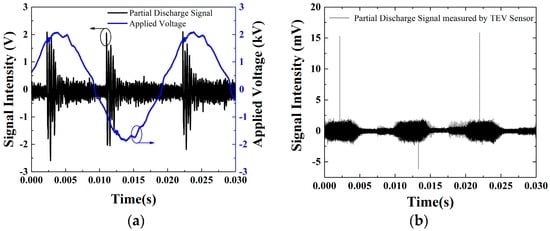 (a) The applied voltage and the partial discharge signal detected by the interferometer system; (b) The partial discharge signal detected by the transient earth voltage (TEV) sensor.