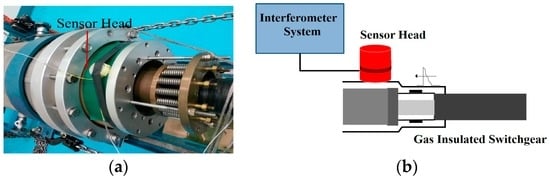 As is known, the traditional technique of the detection of acoustic emission generated from partial discharge is a piezoelectric transducer (PZT) that has a high sensitivity, but the huge electromagnetic stresses often limit it from being used widely [9]. Therefore, acoustic sensors based on optical fiber interference are presented, which have the property of immunity from electromagnetic interferences [10]. Recently, a number of fiber optic sensors with various structures have been developed to detect acoustic emission signals from PD, including Faber-Perot interferometer sensors [11,12,13], fiber Bragg grating (FBG) sensors [14,15], Sagnac interferometer sensors [16,17], and the interference sensor based on fiber lasers [18,19].