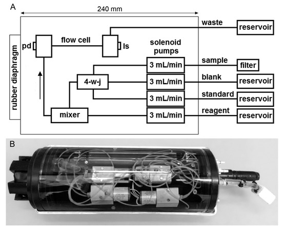 Several analyzer systems that can be used for the in situ determination of dissolved Mn are reported in the literature, such as SCANNER [39], SUAVE [40], GAMOS [41], and certain microelectrodes [42], as well as a novel microfluidic system [43]. Although all of them were successfully deployed in the field, most of them did not possess all of the features needed to fully resolve small-scale variability of dissolved Mn at low micromolar levels as they occur, for example, across the pelagic redoxclines of the central Baltic Sea basins. GAMOS has a response time of approximately 6 min. [44] and other systems only showed measurement frequencies of 10 s [37] and 8 min [43], respectively. Microelectrodes, however, have a too-high minimum detection limit of about 3 M–5 M [42] and in general have a relatively short deployment time.
