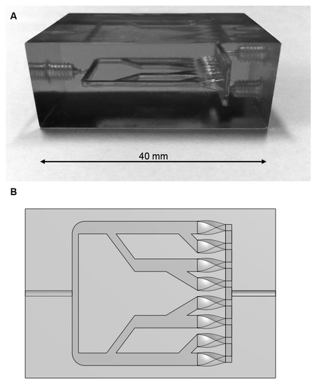 A custom mixing cell was developed, as a thorough analysis of the analyzers fluidics had revealed that the fluidics flow resistance was on the upper limit of the pumps’ specifications. The traditional mixing coil (a long piece of coiled tubing) was then replaced by the 3D-printed PMMA mixing cell (Figure 2). The mixer design is based on a multilaminar concept, expanding the contact surface of the two fluid streams by splitting them up in eight streams before combining them again. A CFD (computational fluid dynamics) simulation was used to optimize the design for thorough mixing, low fluidic resistance, and low dead volume. The latter is a disadvantage of any mixer design compared to the mixing coil, as it cannot be completely avoided. The tests of the mixer in the analyzer (e.g., as shown in Section 4.1 when switching between blank and standard solutions) showed a sufficiently fast response, so that the new mixer design was used for operation.