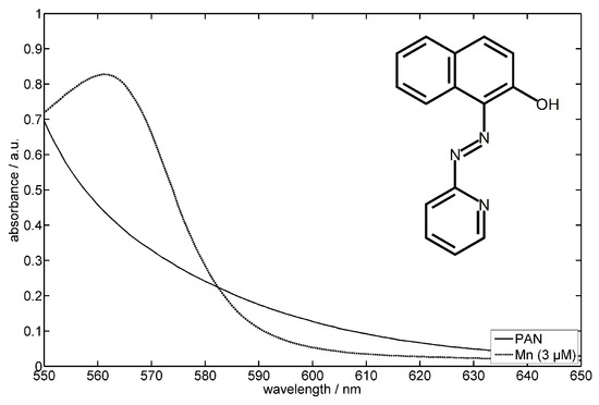 All reagents used in this study were of analytical grade. The method uses 1-(2-pyridylazo)-2- naphthol (PAN) as spectrophotometric reagent in the presence of Triton X-100 and desferrioxamine B (DFO-B). Figure 3 shows the molecular structure of PAN as well as the absorption spectra of PAN and the Mn–(PAN) complex. PAN is a widely used azo dye, and can be used for the determination of a wide variety of metal ions [48,49]; thus, the selectivity of PAN must be enhanced by the use of a masking agent (DFO-B) and pH control [49,50].