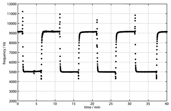Raw data of the pressure testing tank calibration (2 MPa). Frequency (Hz) as a function of time (min) during the measurement of the blank (higher frequencies) and standard (lower frequencies) solution (Mn(II) = 5 M). Frequencies are proportional to the light intensity detected by the light-to-frequency converter.