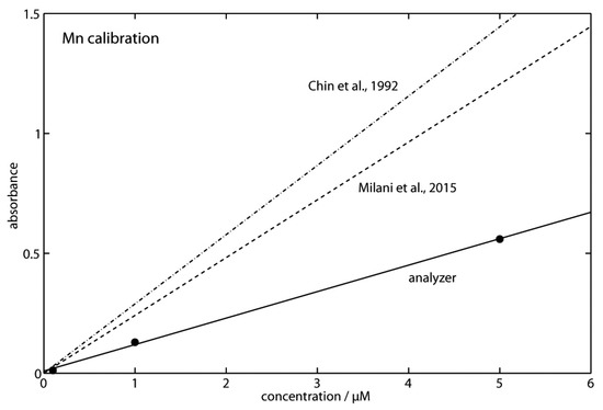 Analyzer calibration lines for dissolved Mn (solid line). Replicate samples (n = 4) were measured for each point. Error bars are within the symbol used for the analyte. The analyzer line is compared to calibrations obtained with other in situ analyzers using the PAN method [33,43]. For comparison purposes, the calibration lines of the other devices are corrected to the analyzer cell length of 14 cm.