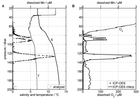 Figure 6A shows the vertical profile of dissolved Mn obtained in the central Gotland Basin as well as corresponding temperature and salinity data. The lag time of the analyzer—defined as the time the sample needs from sample intake to the absorption cell—was determined to be t = 8.2 s, and was used for the synchronization with the CTD data. The dissolved Mn(II) concentrations in Figure 6A were calculated using the calibration shown in Figure 5, as the in situ calibration had to be discarded due to malfunctioning blank and standard pumps. The measured frequency values (proportional to light intensities on the detector) between 45 m and 50 m depth were averaged (n = 48) and taken as blank value (f). Absorbances were then calculated by taking the ratio of f and the measured frequency values between 50 m and 200 m depth (f/f to f/f). As we took a high resolution vertical profile of bottle samples with the pump-CTD, during this profile a field validation can be carried out by comparing the analyzer results with those of ICP-OES analyses of the bottle samples (Figure 6B).