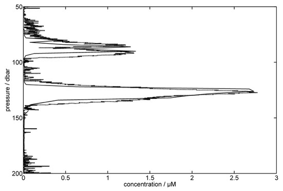 As reported in previous studies, total dissolved Mn concentrations ranging from 0.005 M to 0.04 M in the upper oxic surface waters of the study area were low, but rapidly increased within the pelagic redoxcline, reaching values of up to 20 M [10,11,21]. In our study, ICP-OES analysis revealed maximum dissolved Mn concentrations of 1.3 M and 2.7 M within the first and second anoxic layers, respectively. The analyzer, however, measured maximum dissolved Mn concentrations of 1.0 M and 2.4 M, showing an offset of about 0.3 M. This may be due to a convolution of the peak signals and the low pass response of the analyzer (e.g., due to residual dead volumes in the mixer). Indeed, the analyzer peaks are broader than the ICP-OES signals, and one small peak at 80 m depth is completely missing, actually indicating that concentration gradients existing between the different samples are partly compensated. In addition, dispersion effects may also be a reason for this compensation, particularly the heterogeneous distribution of the flow velocity within the tubing. Therefore, further developments should aim at reducing the length of tubing between sample inlet and absorption cell in order to lower the lag time and ultimately to limit possible dispersion effects. Another explanation for the differences between the analyzer and the ICP-OES profile could be the sensitivity of the analyzer. It is very likely that the sensitivity of the analyzer decreased between the on-shore laboratory calibration and the reported depth profile of dissolved Mn. Experience has shown that the stability of the sensor baseline varies. An accurate in situ calibration could help to monitor the live performance of the analyzer in future deployments. Furthermore, using sodium dodecyl sulphate (SDS) instead of Triton-X 100 for solubilizing PAN may also help resolving this problem by stabilizing PAN-Mn-micelles (M. Skiba and P. J. Statham pers. comm.). However, possible errors due to salinity, temperature, and pressure were minimized by using similar environmental conditions during the test tank calibration. Artifacts due to competing metal ions were also considered as negligible. Indeed, zinc, copper, nickel, and cobalt produce absorbances that are about 50% of the absorbance of Mn [33], but their concentrations in the study area are very low compared with those of Mn [64]. In contrast to this, uncertainties during the ICP-OES measurements (e.g., analytical error, sample preparation) cannot be excluded. However, although the analyzer values did not match ICP-OES values exactly, it can be seen from Figure 6 that the general shape of the analyzer profile agrees with the corresponding ICP-OES concentrations.