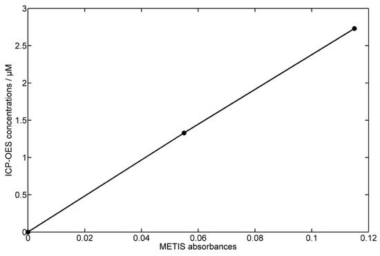 METIS absorbances as a function of dissolved Mn concentrations measured by ICP-OES. Minimum (0.077 M) and maxima (1.3 M, 2.7 M) of ICP-OES measurements were correlated to corresponding METIS absorbances (R = 0.99).