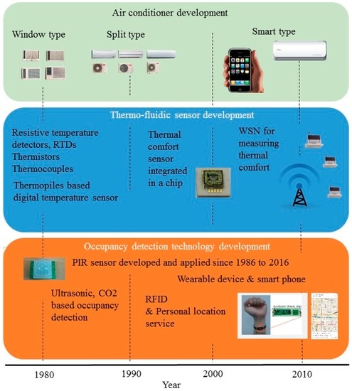 A brief history of the development of air conditioners, thermo-fluidic sensors and occupancy technology illustrating smart air conditioning and smart sensor development qualitatively.