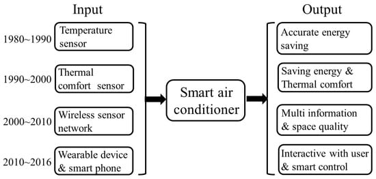 Table 2 summarizes the selected case studies. The developed sensor technologies and achieved smart controls of the selected case studies in Table 2 is summarized qualitatively in Figure 2. The developed sensor technologies for smart air conditioner includes temperature sensors (1980–1990), thermal comfort sensors (1990–2000), wireless sensor networks (2000–2010) and wearable device & smartphones (2010–2016), and these technologies caused the followed results for smart air conditioner, such as accurate energy saving, saving energy and thermal comfort, multi-information and space quality, and interactive with user and smart control, respectively.