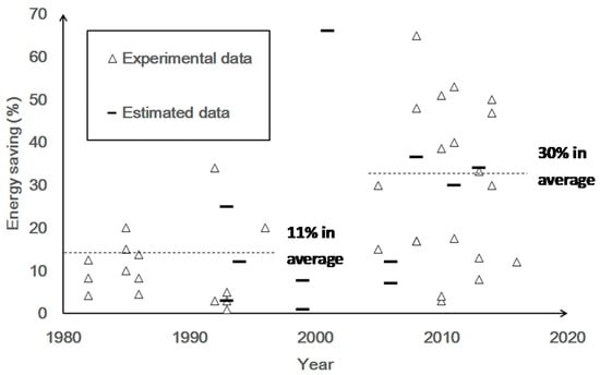 Quantitative energy savings could be used in discussing whether sensor improvement would significantly improve energy savings of air conditioner or not. Several experimental data, supplemented by several simulations or estimators from the published papers [60,61,64,70,76,77], were utilized to calculate the energy savings by Equation (1). This study simultaneously accounted the experimental and estimated data to evaluate energy saving performance based on sensor development. However, only the experimental data would be adopted for identifying the trend of energy savings.